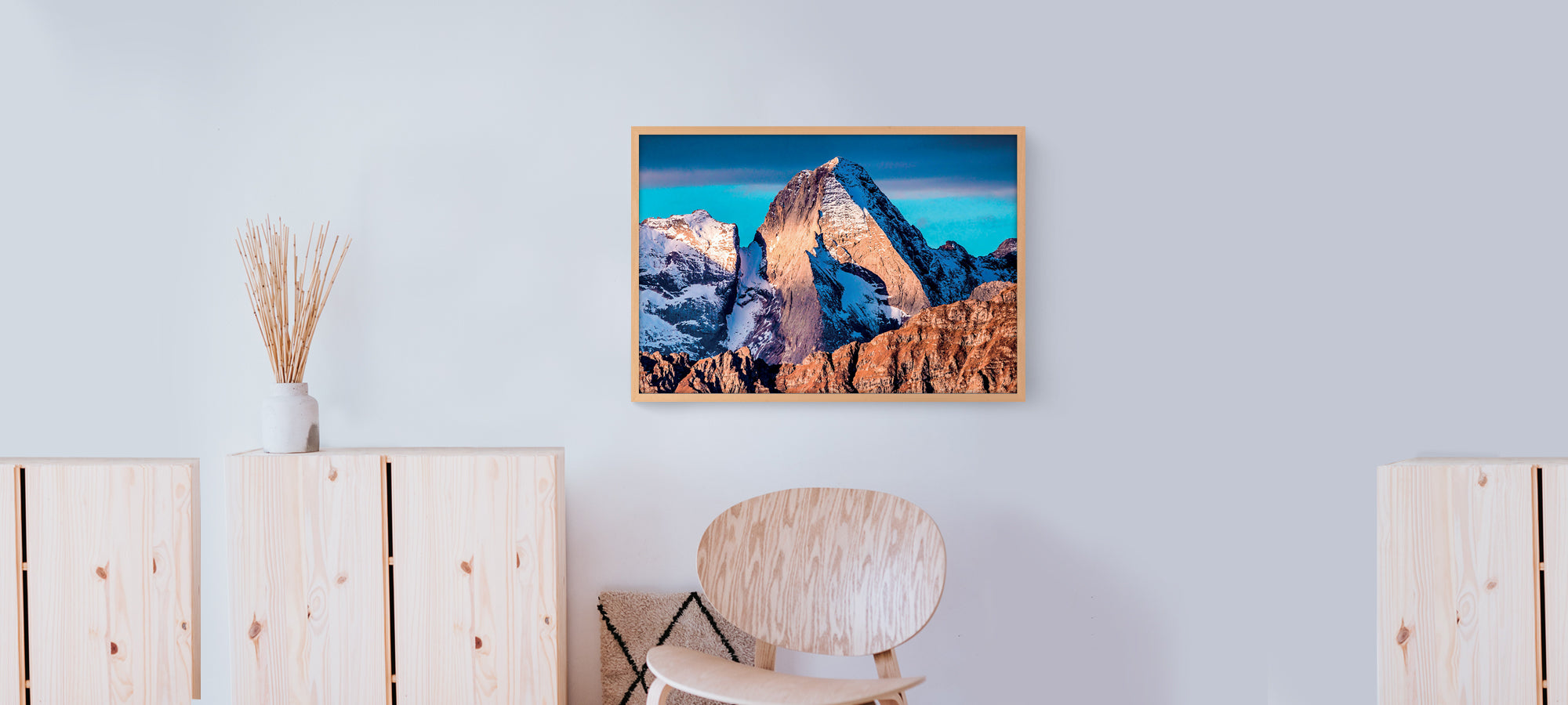 This work is available on Fine Art photographic paper or on Tiziano Canvas. The inks used are of the highest quality and long-lasting, guaranteeing brilliant and long-lasting color rendering. The colors in this image are imbued with contrasting emotions: the warm golden light that embraces the peaks conveys a feeling of calm and serenity, while the intense blue of the sky suggests infinite depth and a sense of wonder at the grandeur of nature.