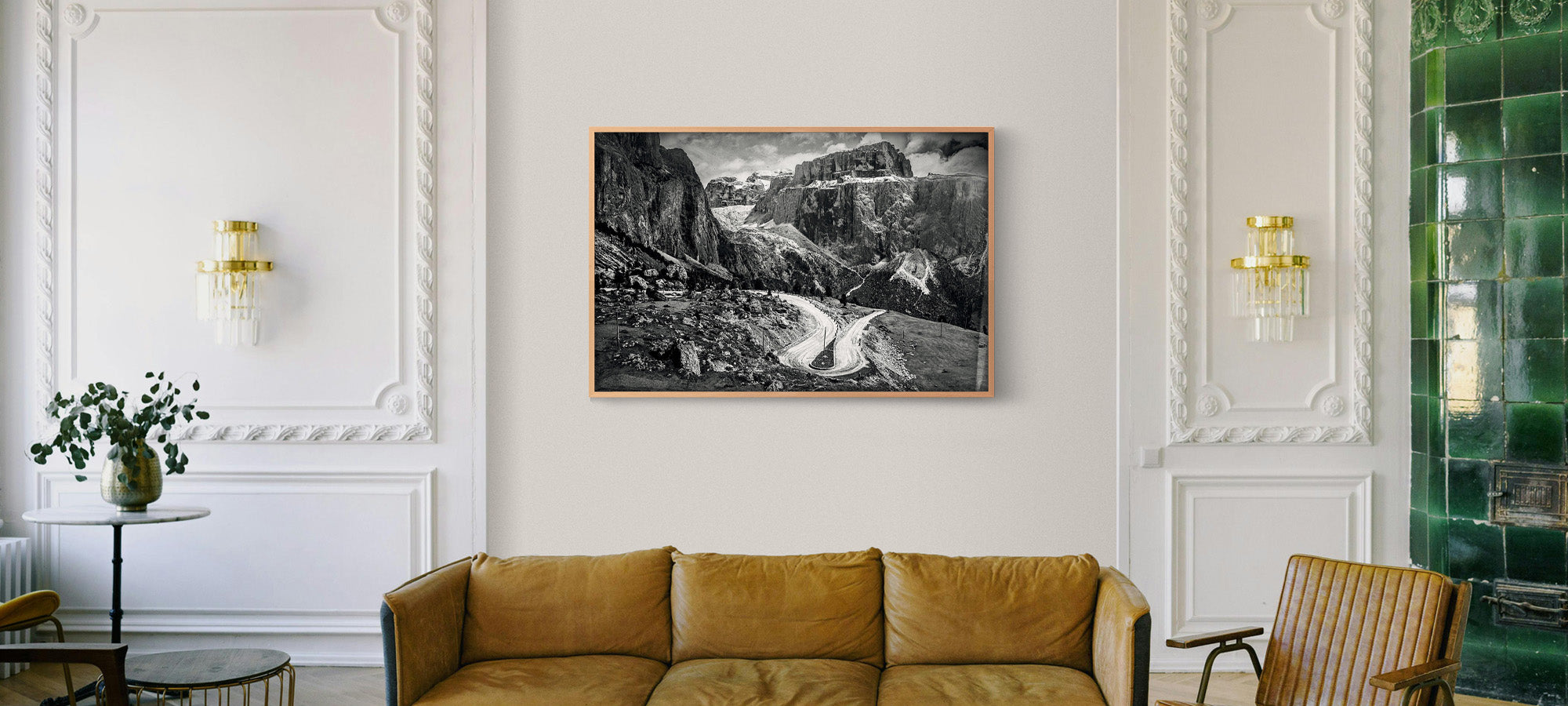 This work is available on Fine Art photographic paper or on Tiziano Canvas. The inks used are of the highest quality and long-lasting, guaranteeing brilliant and long-lasting color rendering. The combination of natural elements, such as rock, snow and cloudy skies, helps to create a suggestive and engaging atmosphere. The vastness of the mountains compared to the smallness of the road and humans inspires a sense of humility and wonder at the power of nature.