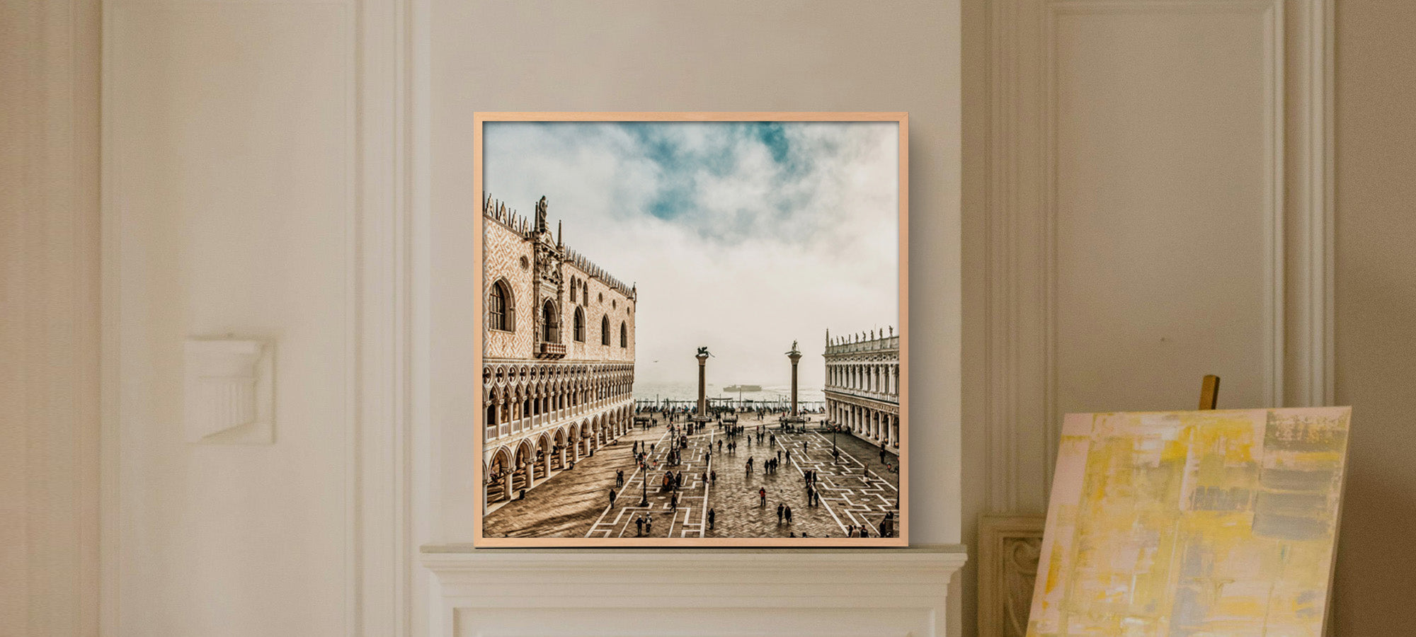 Questa immagine cattura l'essenza di una giornata tranquilla e nostalgica in una delle piazze più affascinanti d'Italia. La tonalità seppiata e l'atmosfera ovattata evocano un senso di calma e serenità, mentre gli edifici storici e le colonne imponenti trasmettono un'aura di grandezza e storia.