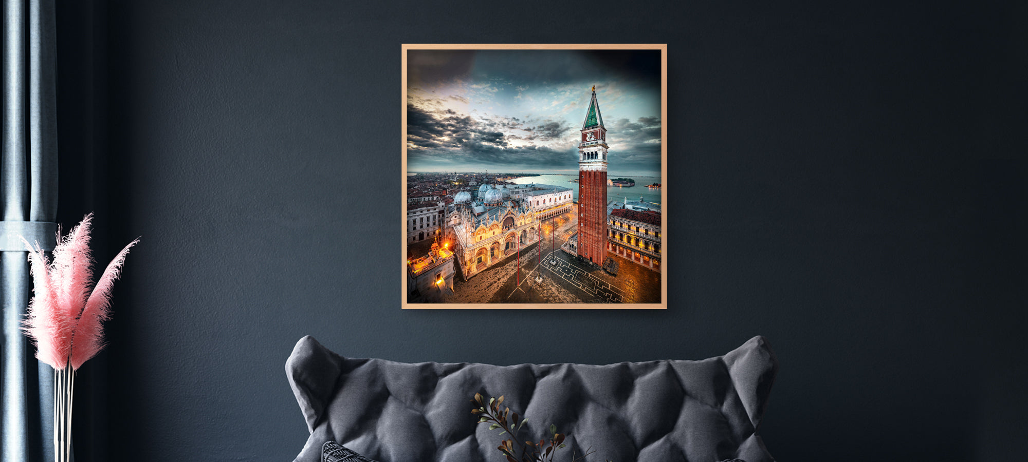 Il campanile di San Marco domina l'immagine al centro, circondato da altri edifici storici come la Basilica di San Marco e il Palazzo Ducale. Il cielo nuvoloso crea un'atmosfera suggestiva e drammatica, mentre le luci dell'illuminazione notturna cominciano a brillare, aggiungendo un tocco di calore alla scena.