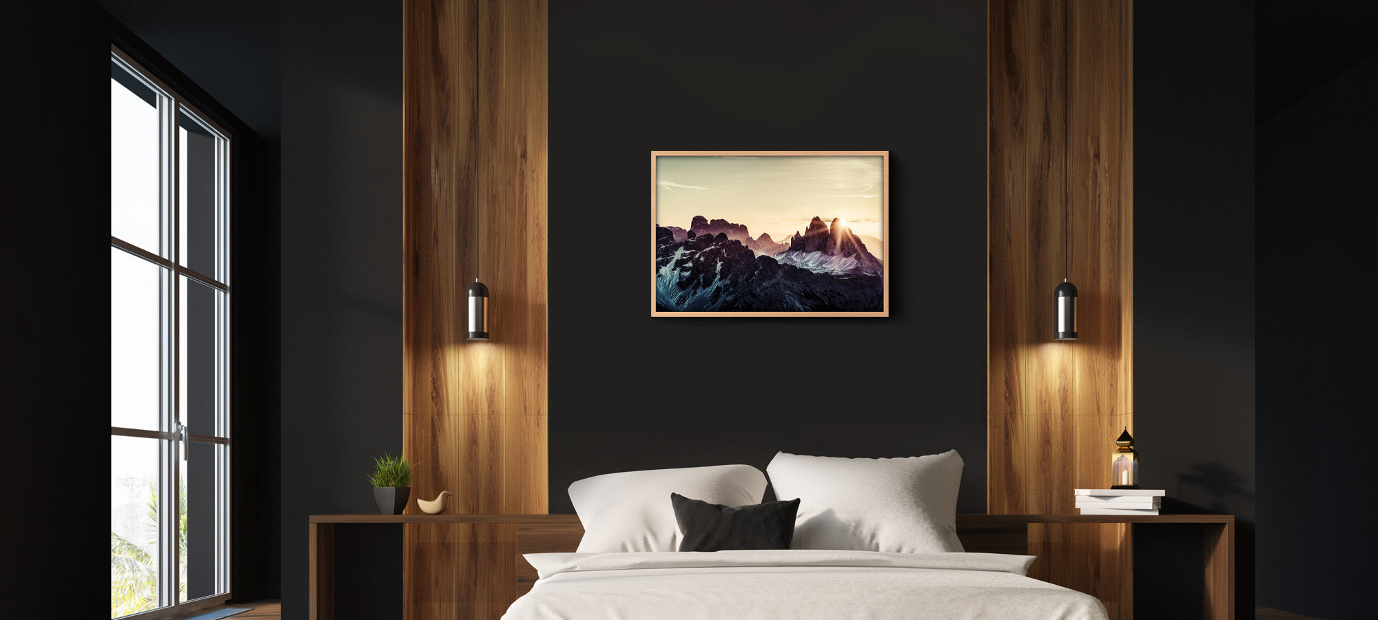Quest'opera è disponibile su carta fotografica Fine Art o su Tela Tiziano Canvas. Gli inchiostri utilizzati sono di altissima qualità e a lunga durata, garantendo una resa cromatica brillante e duratura nel tempo. L'aurora sorge lentamente dietro le vette, dipingendo il cielo con tonalità di rosa e arancione. I raggi del sole filtrano attraverso le creste rocciose, diffondendo una luce dorata che bacia dolcemente la terra ancora addormentata.