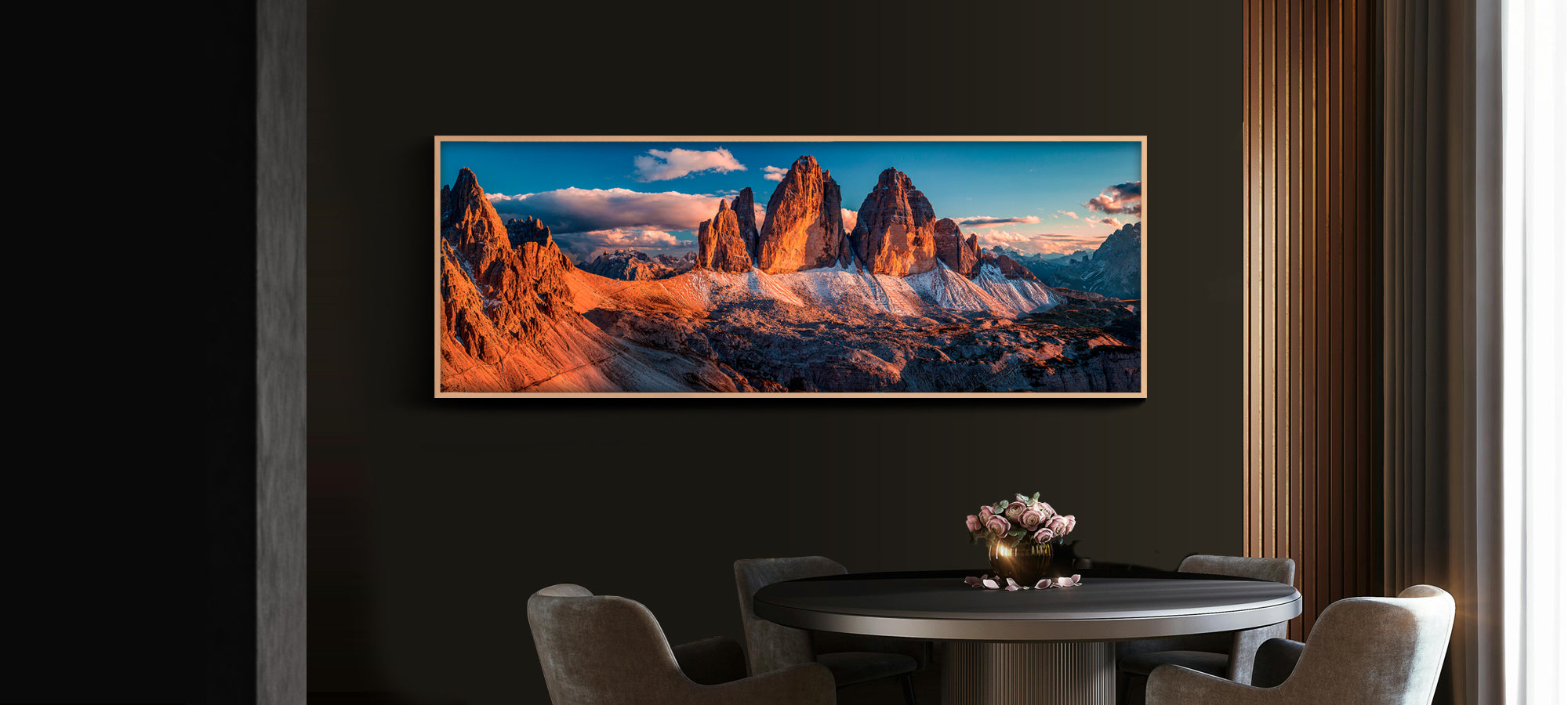 Quest'opera è disponibile su carta fotografica Fine Art o su Tela Tiziano Canvas. Gli inchiostri utilizzati sono di altissima qualità e a lunga durata, garantendo una resa cromatica brillante e duratura nel tempo. Un maestoso scenario montuoso si staglia contro il cielo serale, dipinto con pennellate dorate dalla luce del tramonto. Le nuvole giocano con i loro contorni, danzando delicatamente attorno alle cime imponenti, mentre il freddo abbraccio della neve contrasta con la calda carezza dei raggi solari.